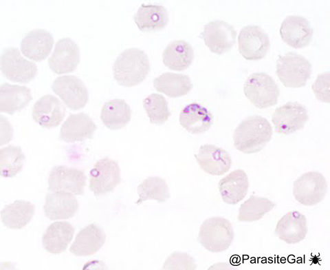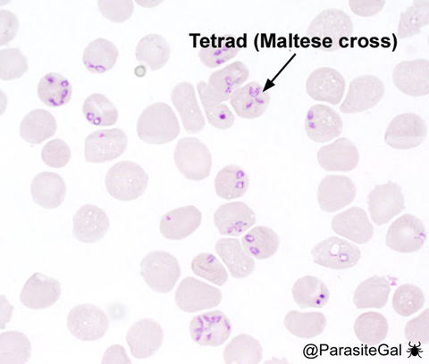 Babesia spp. are seen on thin blood films as variably-sized round, oval and elliptical forms within red blood cells. Extracellular forms are also commonly seen. Although they have a similar appearance to the ring forms of Plasmodium falciparum, they exhibit greater size and shape variability and are more likely to have extracellular forms. Rarely, Babesia spp. form the characteristic 'Maltese-cross' or tetrad form which is not seen in malaria. Other features that are helpful in differentiating Babesia from P. falciparum is the lack of malaria pigment and banana-shaped gametocytes in the former.