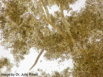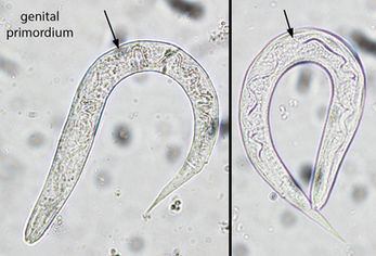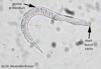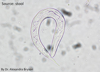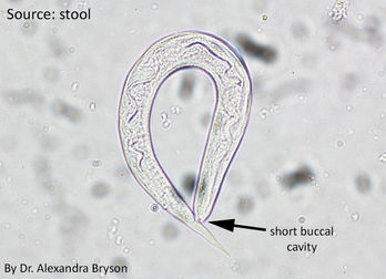 The L1 stage of Strongyloides stercoralis, also known as rhabditiform larvae, are relatively short, have a prominent genital primordium, and short buccal canal. Hookworm rhabditiform larvae have a similar appearance but have a long buccal canal and lack a prominent genital primordium. While S. stercoralis L1 larvae are the most common form of this parasite seen in stool, hookworm L1 larvae are only seen in stool when there is a delay in processing/preservation and hookworm eggs within the stool specimen are allowed to mature and hatch.