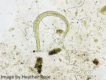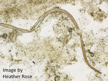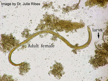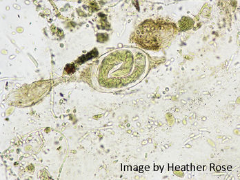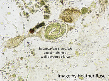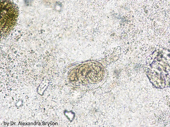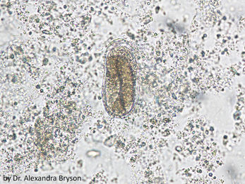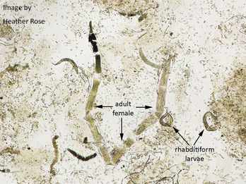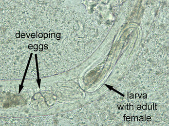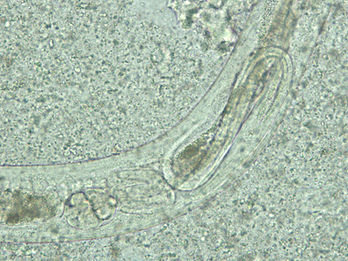Strongyloides stercoralis adults and eggs are almost never seen in stool specimens. Instead, it is more common to see the L1 (rhabditiform) and/or L3 (filariform) larvae. However adults can be seen in some heavy infections and may have developing eggs or larvae within them, as shown in this case. Photos courtesy of Boren Huot and Dr. Julie Ribes.