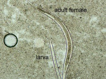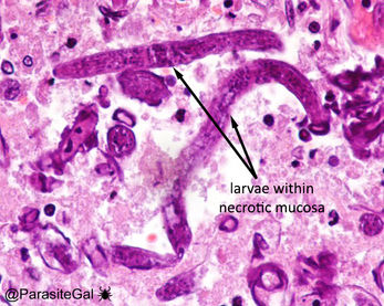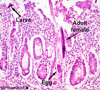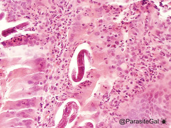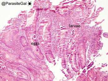 Strongyloidiasis is occasionally diagnosed by microscopic examination of hematoxylin and eosin-stained tissue sections. Examination of intestinal biopsies usually reveals larvae and eggs within the intestinal mucosa. Less commonly, adult females are seen.