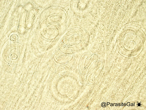 Trichinella species larvae, unstained, in muscle squash preparations